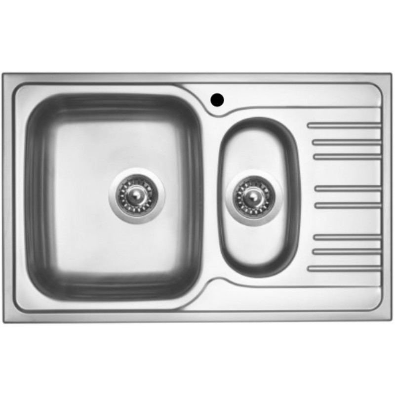 Nerezový dřez s vaničkou a odkapem, plech 0,6 mm, matný, otočný, rozměr 780 x 500 mm, vana 350 x 410 x 170 mm a 165 x 310 x 120 mm, horní montáž, minimálně 60 cm skříňka.